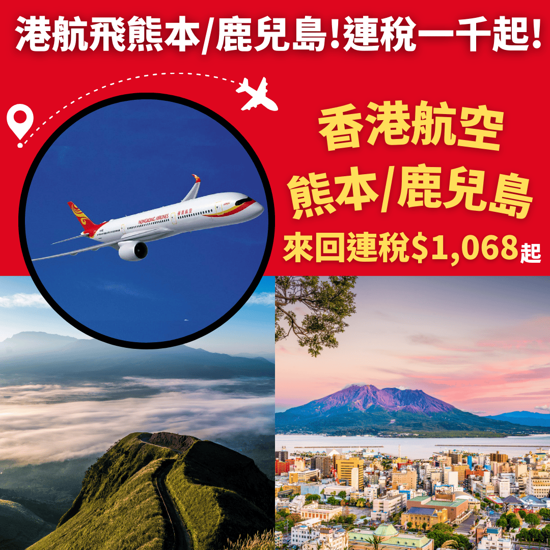 香港飛鹿兒島來回連稅只需$1,038起、熊本$1,075起