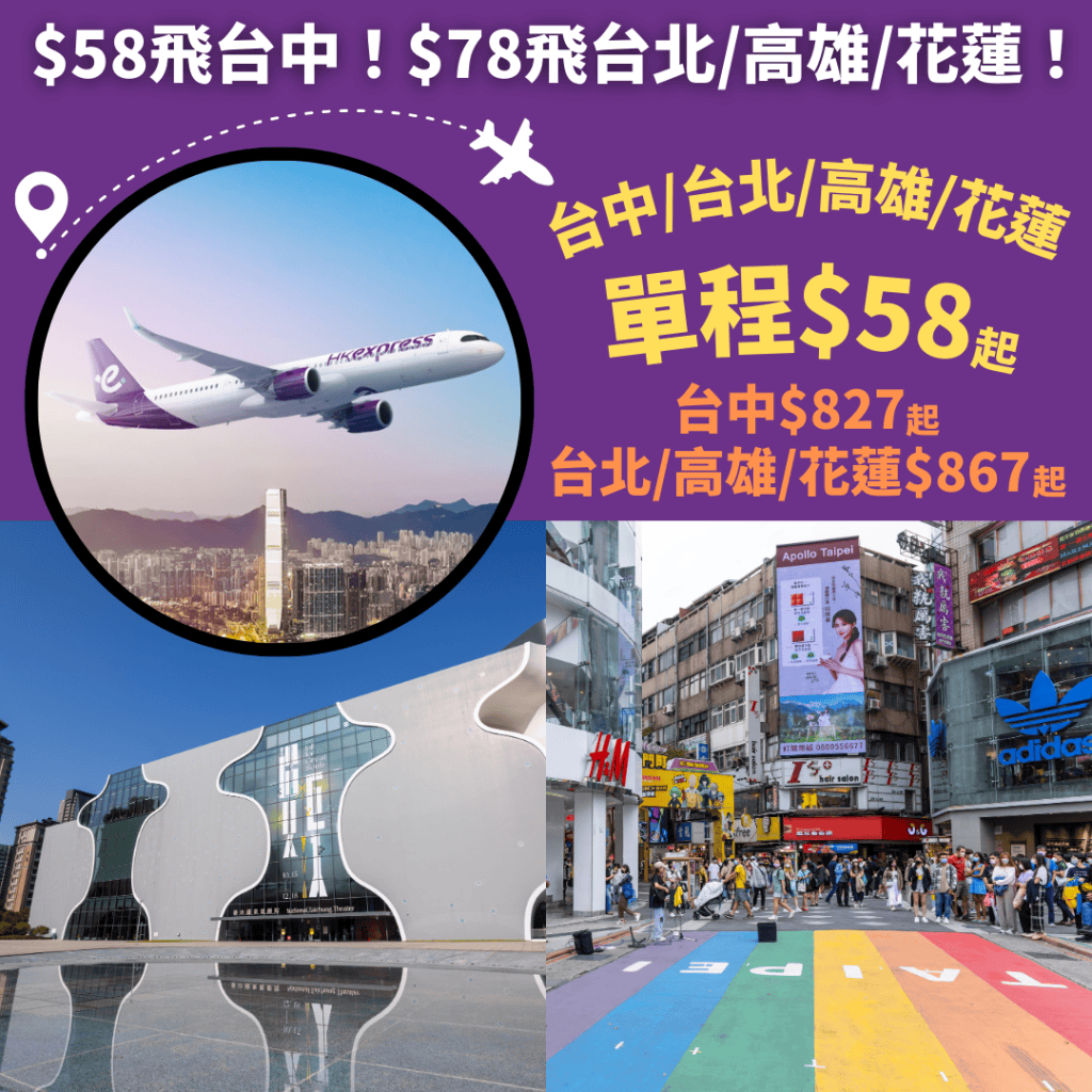 $58飛台中!$78飛台北/高雄/花蓮!明年3月29日前出發!香港飛台北/高雄/台中/花蓮單程只需$58起 – HK Express