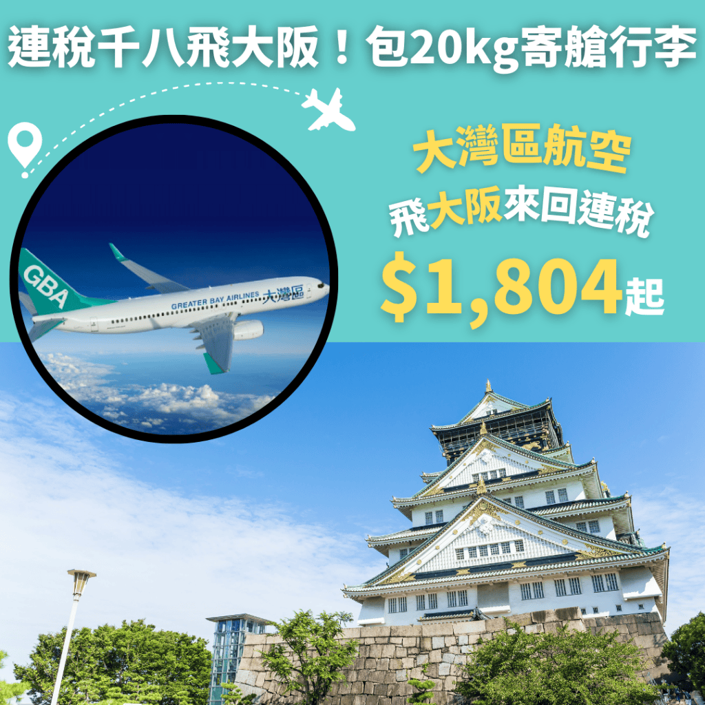 連稅千八飛大阪!包20kg寄艙行李!明年3月27日前出發!香港飛大阪來回連稅只需$1,804起 – 大灣區航空 (優惠至11月12日)