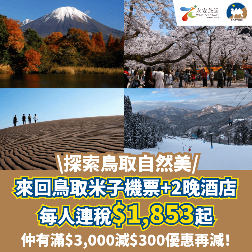 【永安旅遊 X 鳥取旅遊局】鳥取米子機票+酒店自由行套票滿$3,000即減$300!
