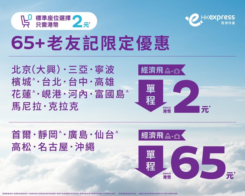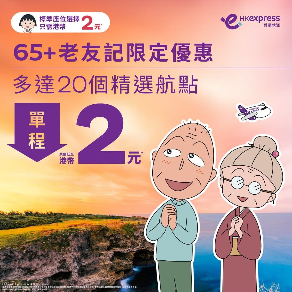 老友記出發啦!HK Express 65+老友記限定優惠!日韓台越等20個精彩航點單程$2起!揀位$2優惠 – HK Express (優惠至11月18日)