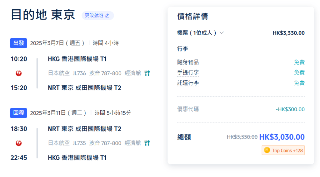 以3月7日出發,3月11日返回為列,香港飛東京成田來回連稅$3,030 (滙豐信用卡減$300)