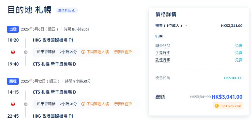 以3月6日出發,3月12日返回為列,香港經東京成田飛札幌來回連稅$3,041 (滙豐信用卡減$300)