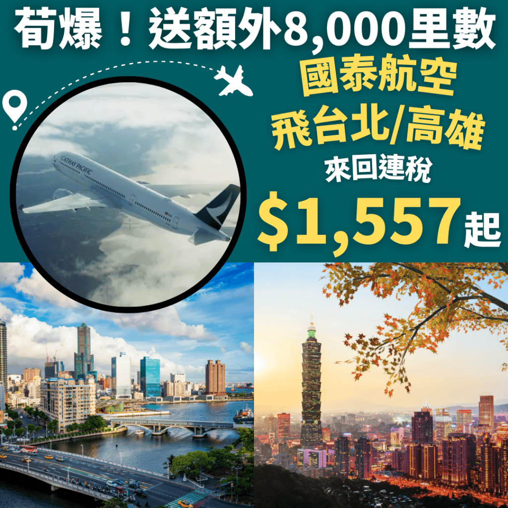 荀到爆!送額外8,000里數!國泰飛台北/高雄!香港飛台北、高雄來回連稅只需$1,557起 – 國泰航空 (優惠至12月26日)