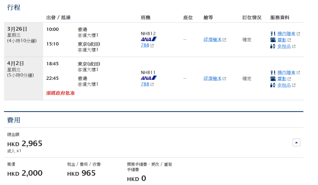 以3月26日出發,4月2日返回為列,香港飛東京成田來回連稅$2,965起