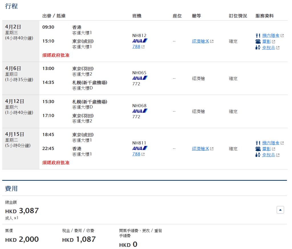 以2/4香港飛東京成田,6/4東京羽田飛札幌,12/4札幌飛東京羽田、15/4東京成田飛香港,來回連稅$3,087