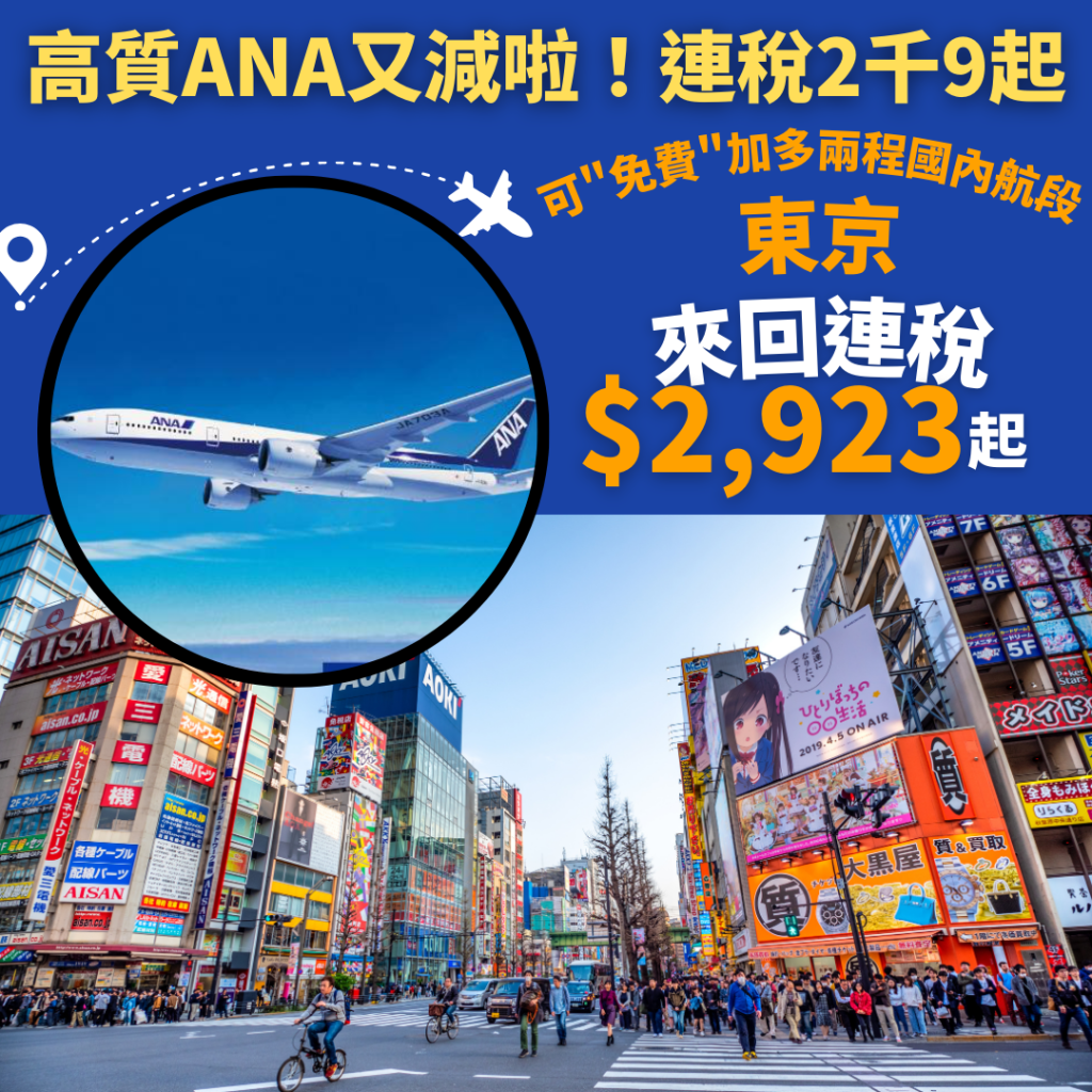 嘩!高質ANA又減啦!連稅2千9起!可”免費”加多兩程國內航段!香港飛東京來回連稅只需$2,923起、札幌$2,929起 – ANA全日空 (優惠至12月17日)