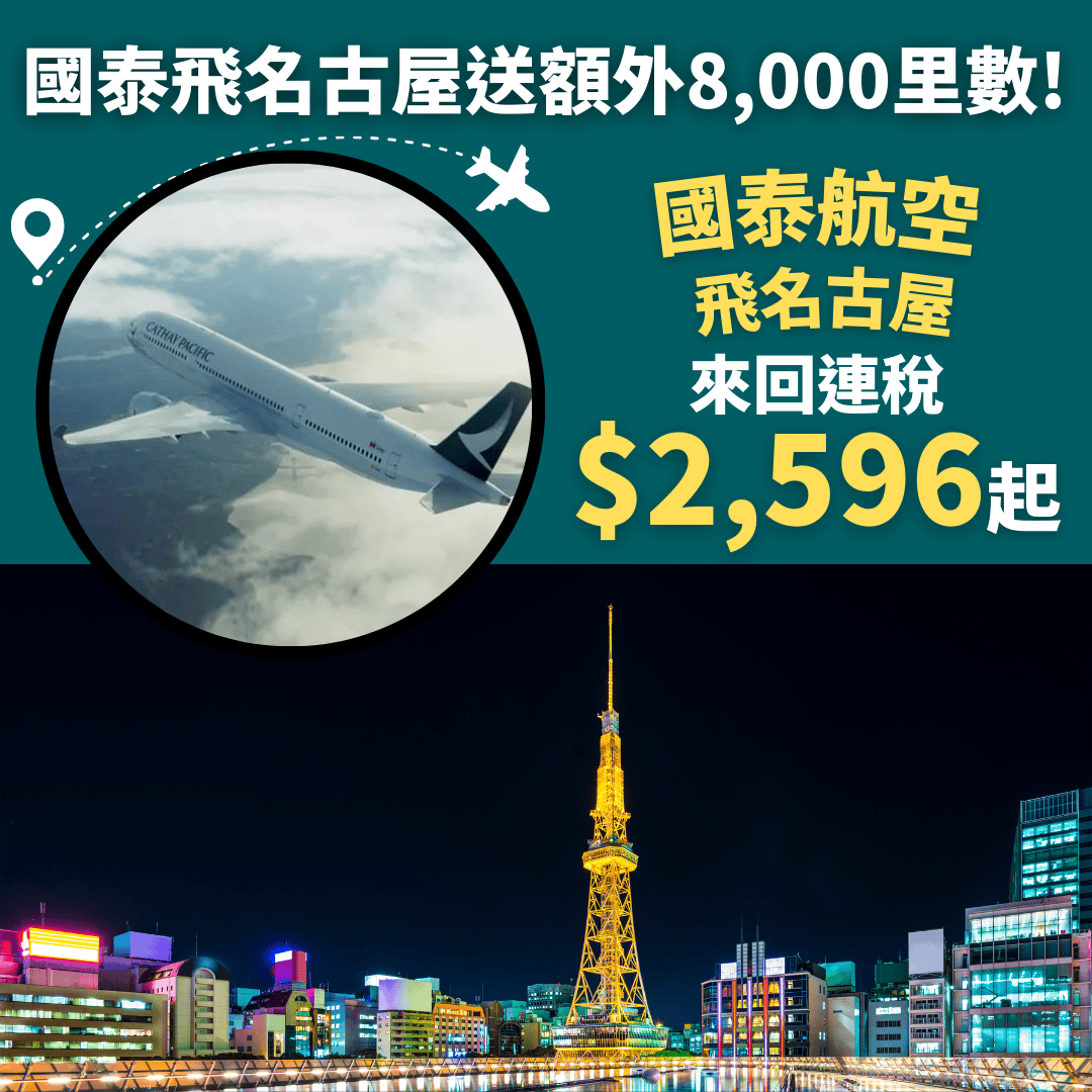 最後召集!國泰飛名古屋送額外8,000里數!香港飛名古屋來回連稅只需$2,596起 – 國泰航空 (優惠至12月26日)