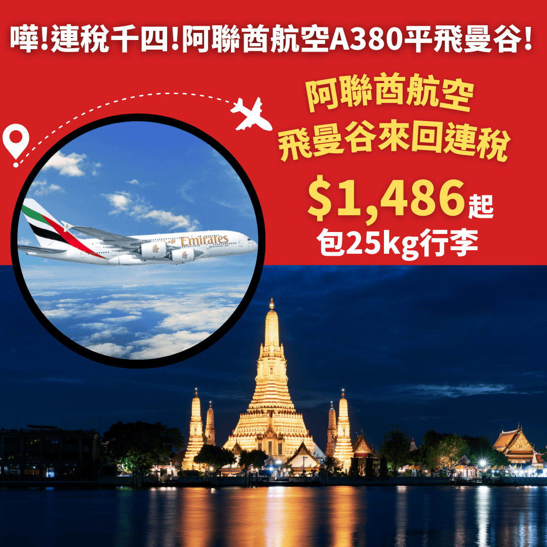 嘩!連稅千四!阿聯酋航空A380平飛曼谷!包25kg行李!明年6月19日前出發!香港飛曼谷來回連稅只需$1,486起 – 阿聯酋航空 (優惠至12月31日)
