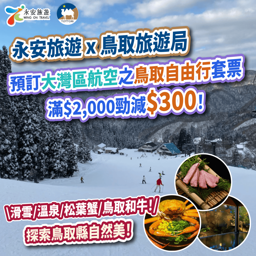 【永安旅遊 x 鳥取旅遊局】探索鳥取縣自然美!大灣區航空鳥取自由行套票滿$2,000勁減$300!歎盡滑雪/溫泉/松葉蟹/鳥取和牛!
