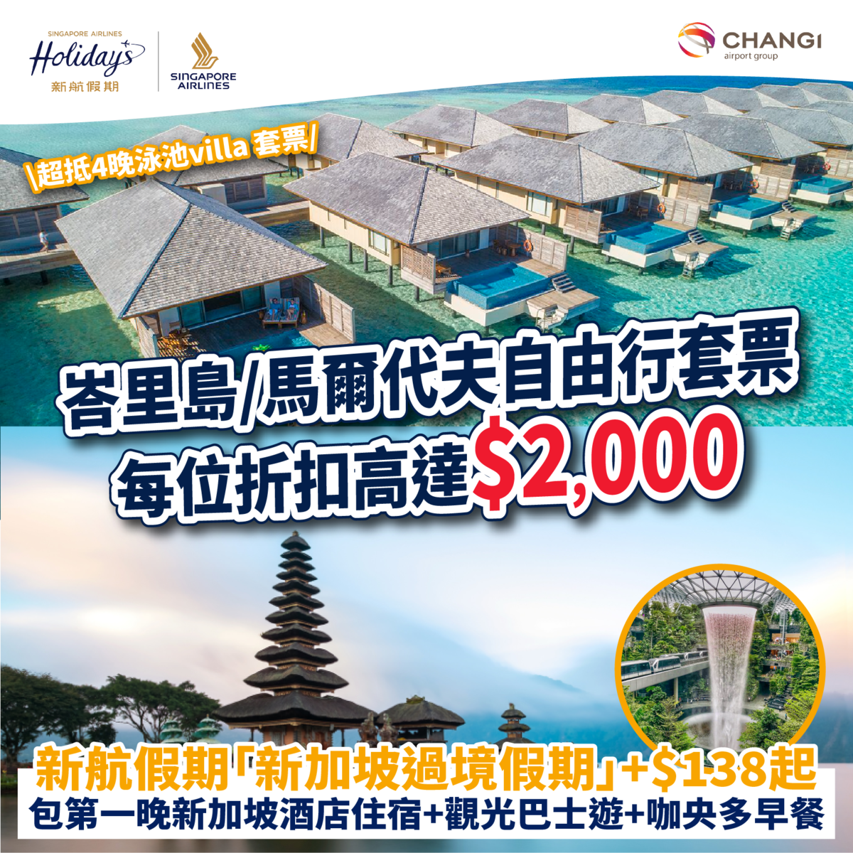 峇里島/馬爾代夫激筍獨家套票優惠!每位折扣高達$2,000!仲有過境新加坡優惠+$138起,包第一晚新加坡酒店+觀光巴士遊+咖央多早餐 – 新航假期