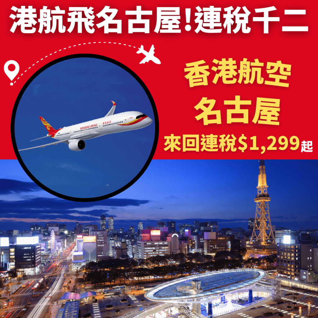 港航飛名古屋!連稅千二!6月19日前出發!香港飛名古屋來回連稅只需$1,299起 – 香港航空 (優惠至1月17日)