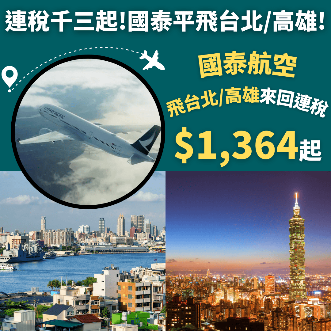 連稅千三起!國泰飛台北/高雄!6月30日前出發!香港飛台北、高雄來回連稅只需$1,351起 – 國泰航空 (優惠至1月19日)