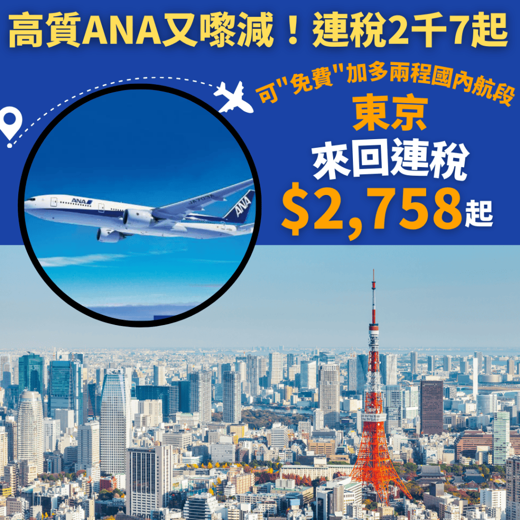 嘩!高質ANA又嚟減!連稅2千7起!可”免費”加多兩程國內航段!香港飛東京來回連稅只需$2,758起、札幌$2,834起 – ANA全日空 (優惠至1月21日)