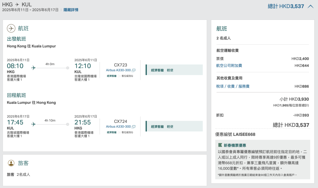 9折後,香港飛吉隆坡二人同行來回連稅每人$1,768起,包23kg行李