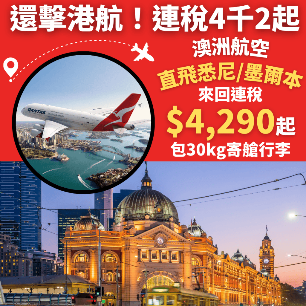 抵呀!還擊香港航空!澳航直飛澳洲連稅4千2起!12月5日前出發!香港直飛悉尼、墨爾本來回連稅$4,290起 – 澳洲航空 (優惠至3月5日)