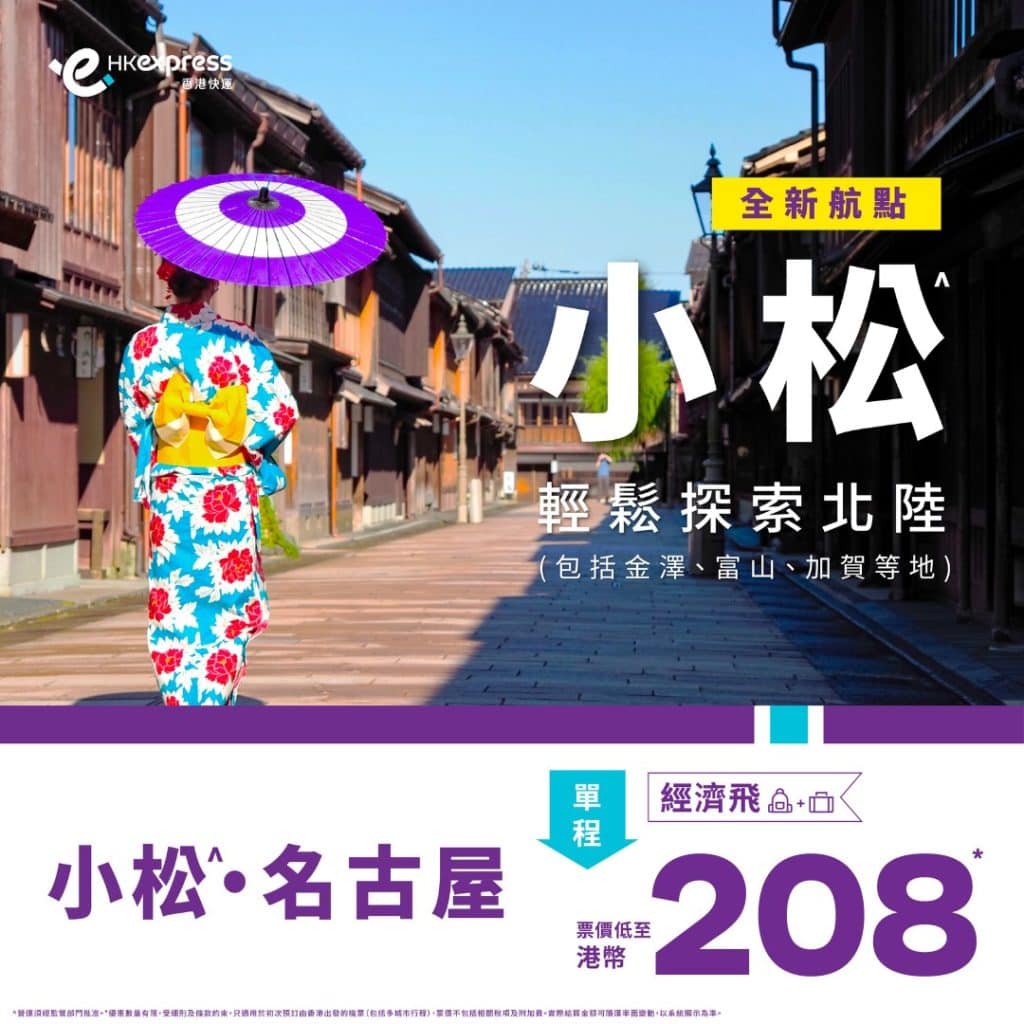 嘩!HK Express又有日本新航點!$158飛小松!4月24日開航!暑假旺季都有平!香港飛小松、名古屋單程只需$158起 – HK Express (優惠至3月4日)