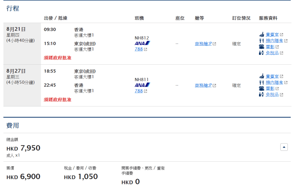 以8月21日出發,8月27日返回為列,香港飛東京成田來回連稅$7,950