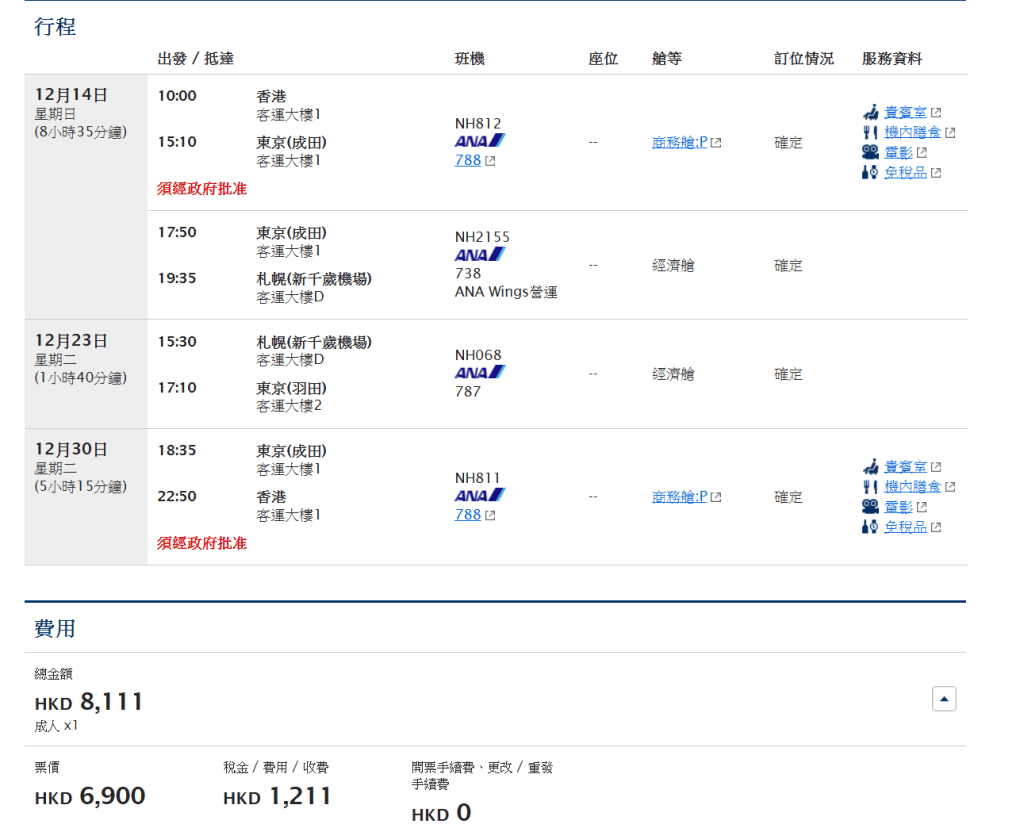 以14/12香港經東京成田飛札幌,23/12札幌飛東京羽田、30/12東京成田飛香港,商務艙來回連稅$8,111
