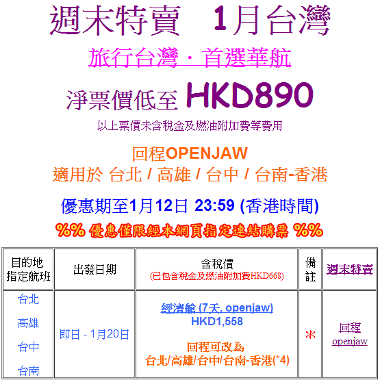 限時優惠!1月20日前出發!一人成行!香港往返台北、高雄、台中、台南只需$890(可open jaw) – 中華航空 (優惠至1月12日)