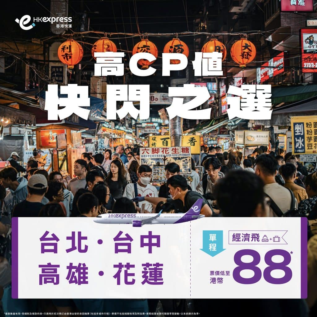 $58飛台北/台中/高雄/花蓮!台灣限時優惠!7月10日前出發!香港飛台北/台中/高雄/花蓮單程只需$58起 – HK Express (優惠至3月23日)