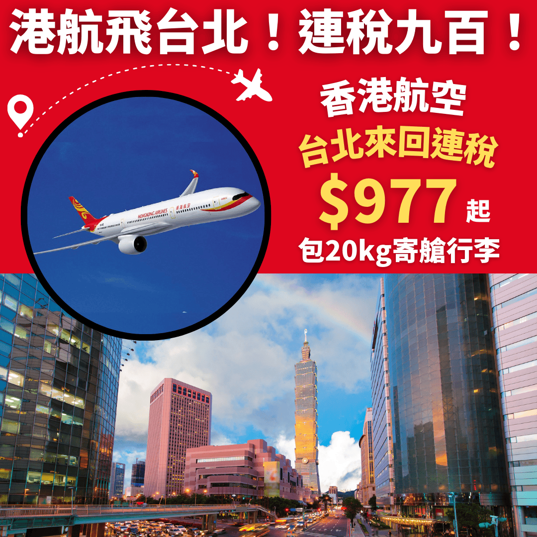 港航飛台北!連稅九百!包20kg行李!香港飛台北二人同行來回連稅每人只需$977起 – 香港航空 (優惠至4月30日)