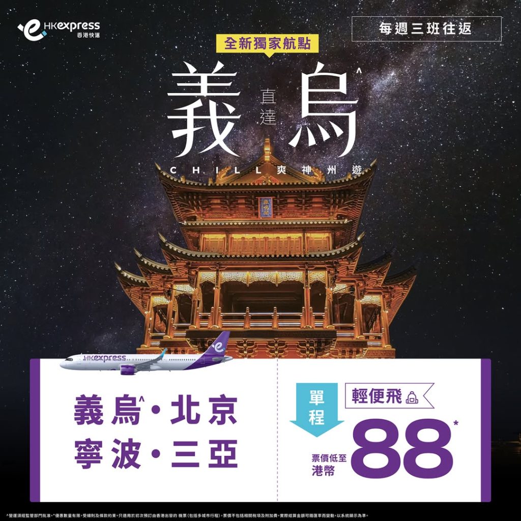 HK Express又有新航線!$88飛義烏!5月29日開航!香港飛北京/寧波/三亞/義烏單程只需$88起 – HK Express (優惠至4月2日)