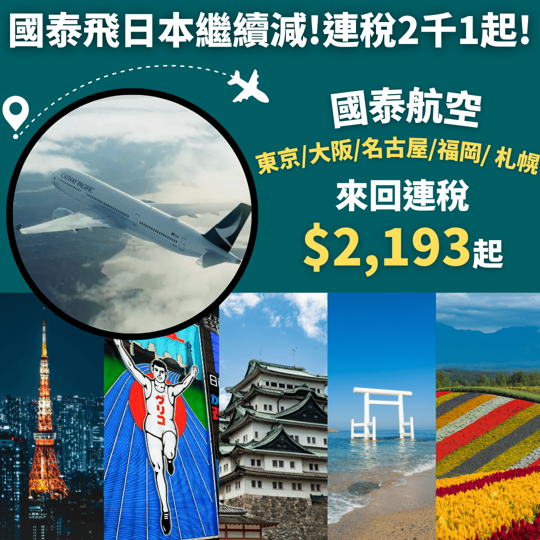 國泰飛日本繼續減!連稅2千1起!7月11日前出發!香港飛東京/大阪/福岡/名古屋/札幌二人同行來回連稅每人只需$2,193起 – 國泰航空 (優惠至4月21日)