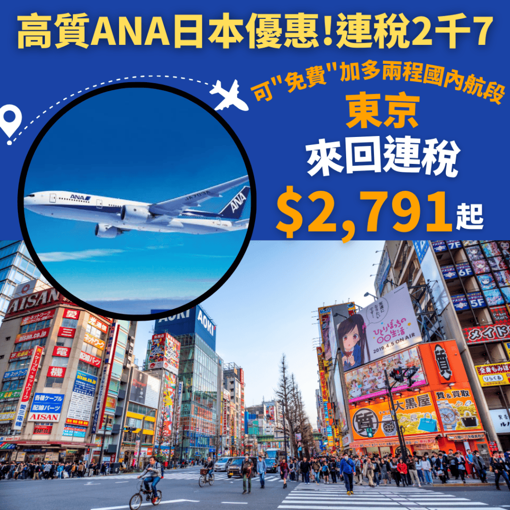嘩!高質ANA又嚟限時5日優惠!連稅2千7起!可”免費”加多兩程國內航段!香港飛東京來回連稅只需$2,791起、札幌$2,805起 – ANA全日空 (優惠至4月8日)