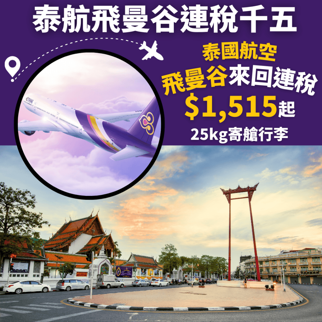 泰航連稅千五飛曼谷!6月30日前出發!香港飛曼谷二人同行來回連稅每人只需$1,515起 – 泰國航空 (優惠至4月30日)