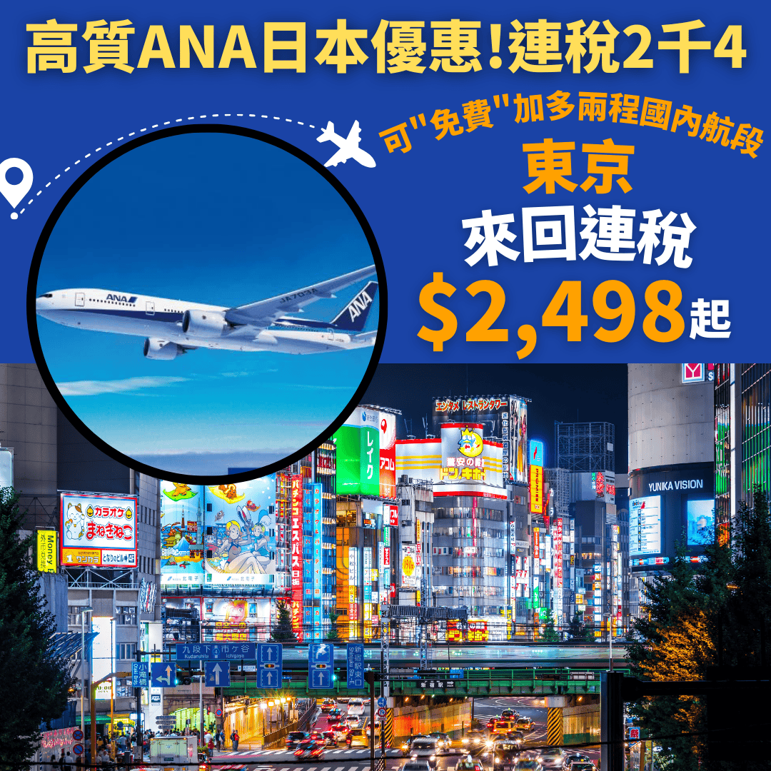 高質ANA又又又再減價!連稅2千4起!可”免費”加多兩程國內航段!香港飛東京來回連稅只需$2,498起、札幌$2,579起 – ANA全日空 (優惠至5月4日)