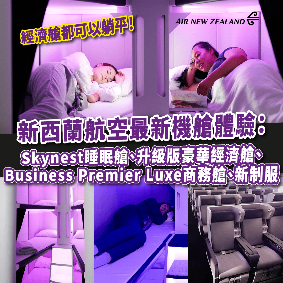 而新西蘭航空繼推出大獲好評嘅Skycouch空中梳化,早前更發布咗多個全新機艙體驗,當中非常矚目嘅有全球首創嘅經濟艙Skynest睡眠艙,另外仲有升級版豪華經濟艙 (Premium Economy) 同埋Business Premier Luxe商務艙!