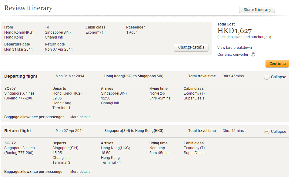 香港往返新加坡只需$930,連稅$1,709,價錢同之前差不多