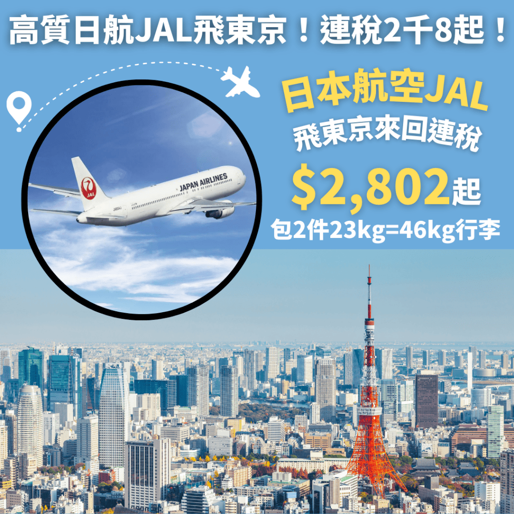 高質日航JAL飛東京!連稅2千8起!明年1月31日前出發!包2件x23kg寄艙行李!香港飛東京成田來回連稅只需$2,802起 – 日本航空 (優惠至4月30日)