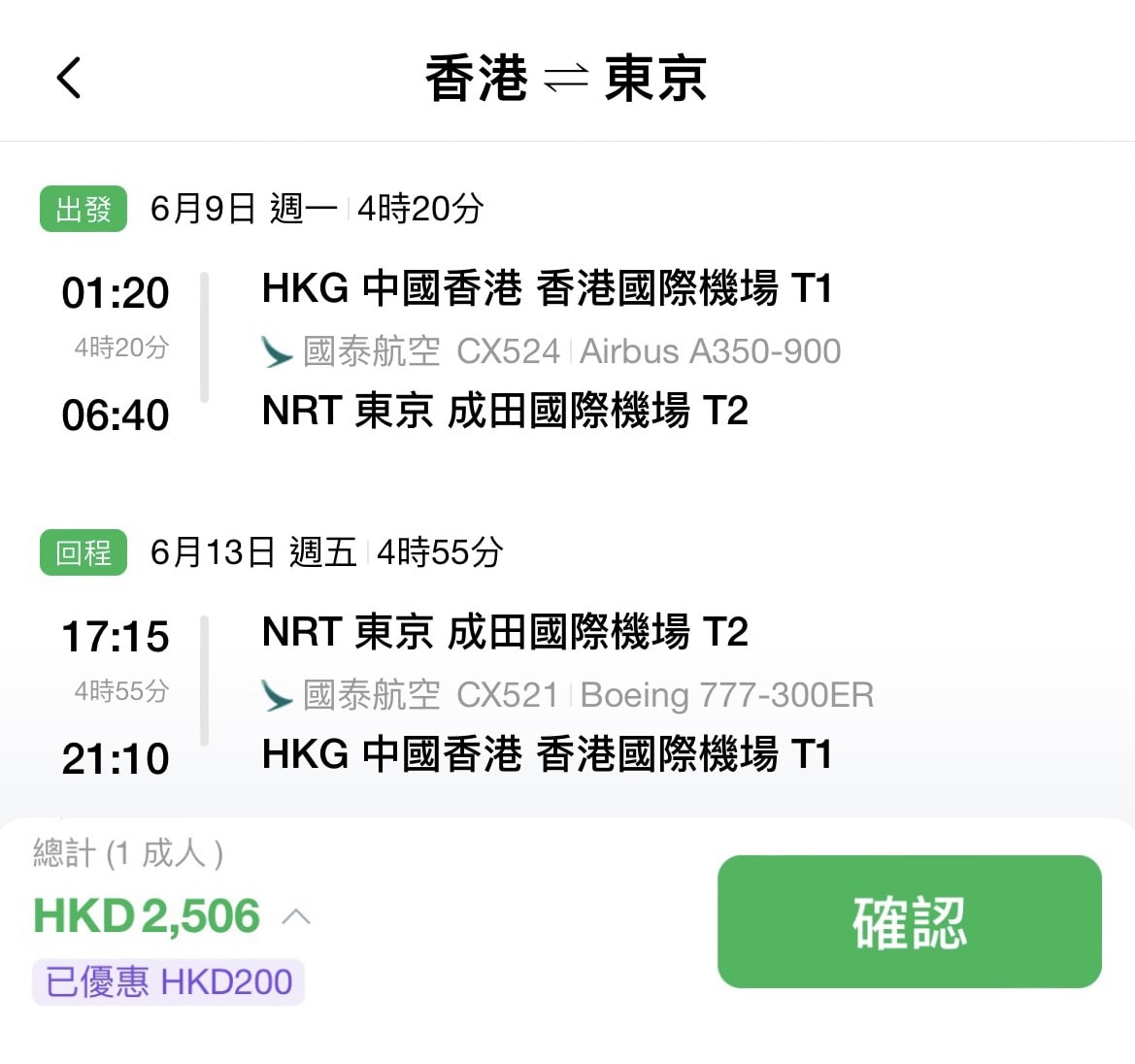 以6月9日出發,6月13日返回為列,香港飛東京成田來回連稅$2,506