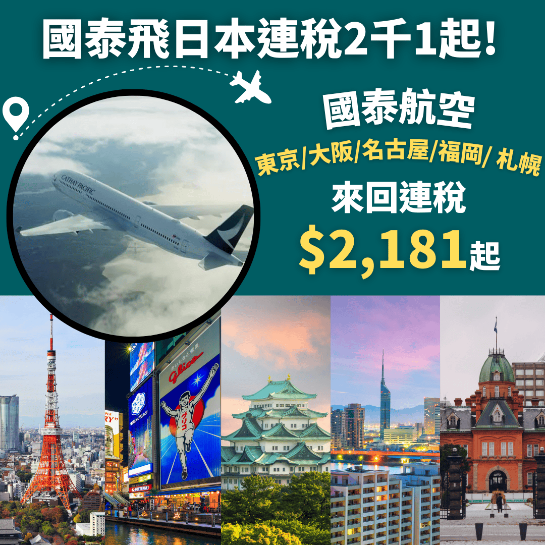 國泰飛日本有埋8月尾同9月出發啦!連稅2千1起!香港飛東京/大阪/福岡/名古屋/札幌來回連稅每人只需$2,181起 – 國泰航空 (優惠至6月30日)