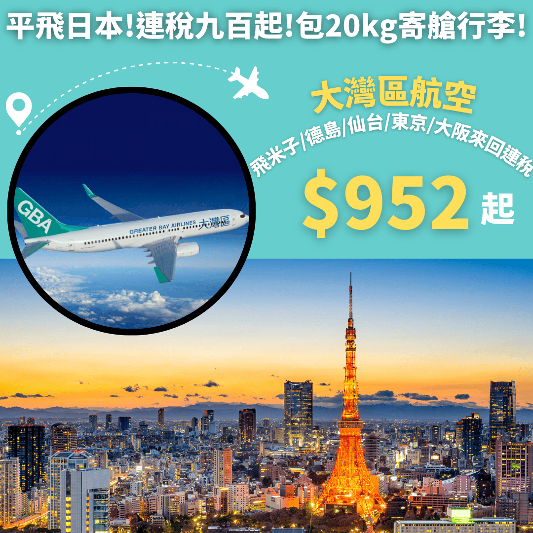 嘩!勁抵呀!連稅九百起平飛日本!包20kg寄艙行李!來回連稅:米子/德島$952起、仙台$1,040起、東京$1,210起、大阪$1,236起 – 大灣區航空 (優惠至5月2日)