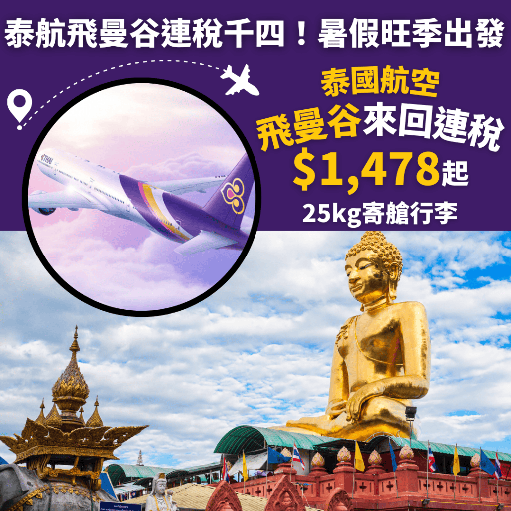 抵呀!泰航連稅千四飛曼谷!9月30日前出發!暑假旺季都有!香港飛曼谷來回連稅只需$1,465起 – 泰國航空 (優惠至5月31日)