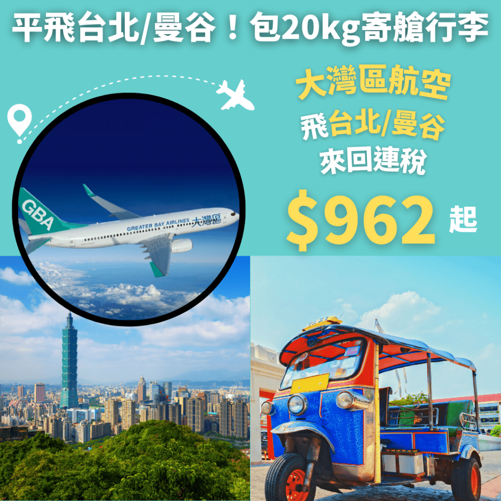 連稅九百飛台北!一千飛曼谷!包20kg寄艙行李!來回連稅:台北$962起、曼谷$1,030起 – 大灣區航空 (優惠至5月5日)