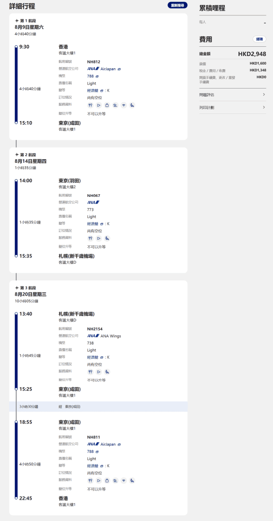 8月9日香港飛東京成田,8月14日東京羽田飛札幌,8月20日札幌經東京成田飛香港來回連稅$2,948