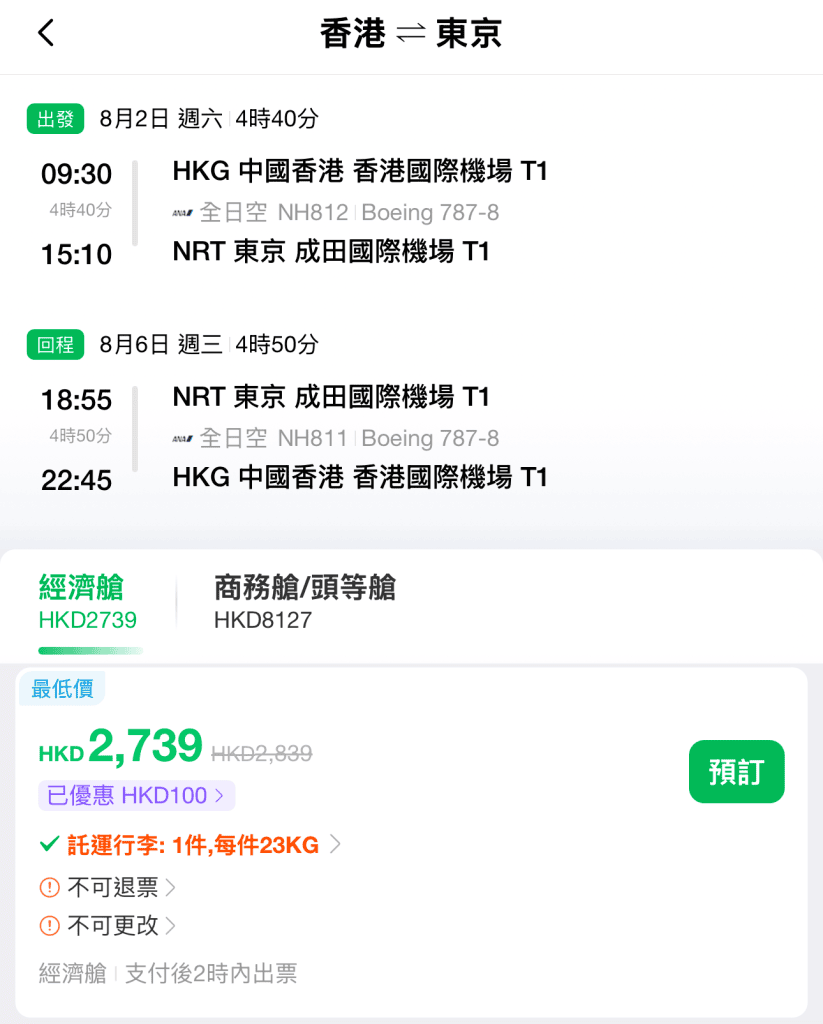 以8月2日出發,8月6日返回為列,香港飛東京成田來回連稅$2,739