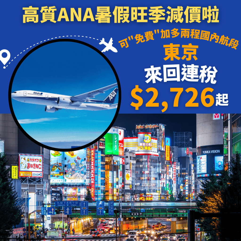 ANA官網:https://www.ana.co.jp/zh/hk/ (來回連稅:東京羽田$2,828起、東京成田$2,840起)