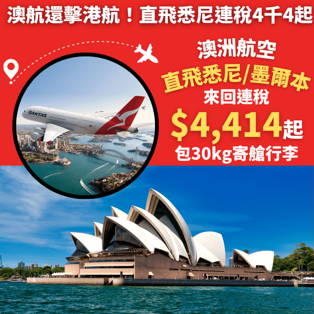澳航還擊港航!直飛悉尼連稅4千4!暑假旺季都有平!10月25日前出發!香港直飛悉尼來回連稅$4,394起、墨爾本$4,436起 – 澳洲航空 (優惠至5月21日)