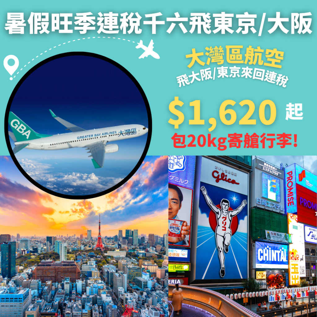 抵呀!暑假旺季連稅千六飛東京/大阪!包20kg寄艙行李!香港飛東京來回連稅只需$1,650起、東京$1,681起 – 大灣區航空 (優惠至5月20日)