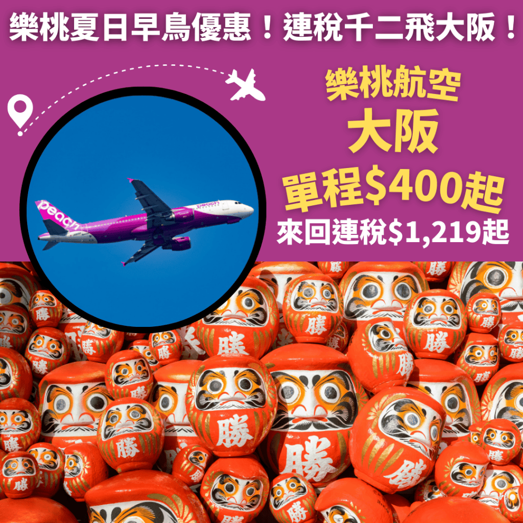 樂桃夏日早鳥優惠!連稅千二飛大阪!10月25日前出發!香港飛大阪單程只需$400起 (不收燃油附加費) – 樂桃航空 (優惠至5月26日)