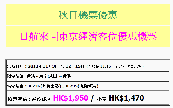 秋日震撼優惠,香港往返東京只需$1,950 – 日本航空 JAL (優惠只做三日至11月5日)
