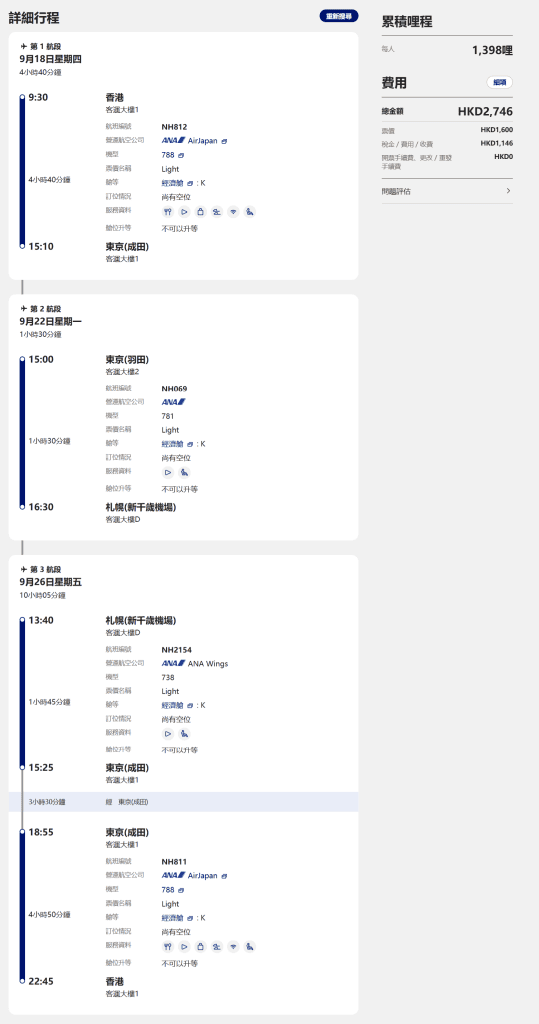 9月18日香港飛東京成田,9月22日東京羽田飛札幌,9月26日札幌經東京成田飛香港來回連稅$2,746