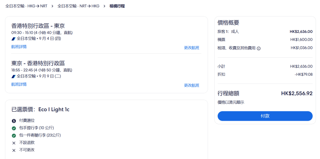 以9月4日出發,9月9日返回為列,香港飛東京成田來回連稅$2,557