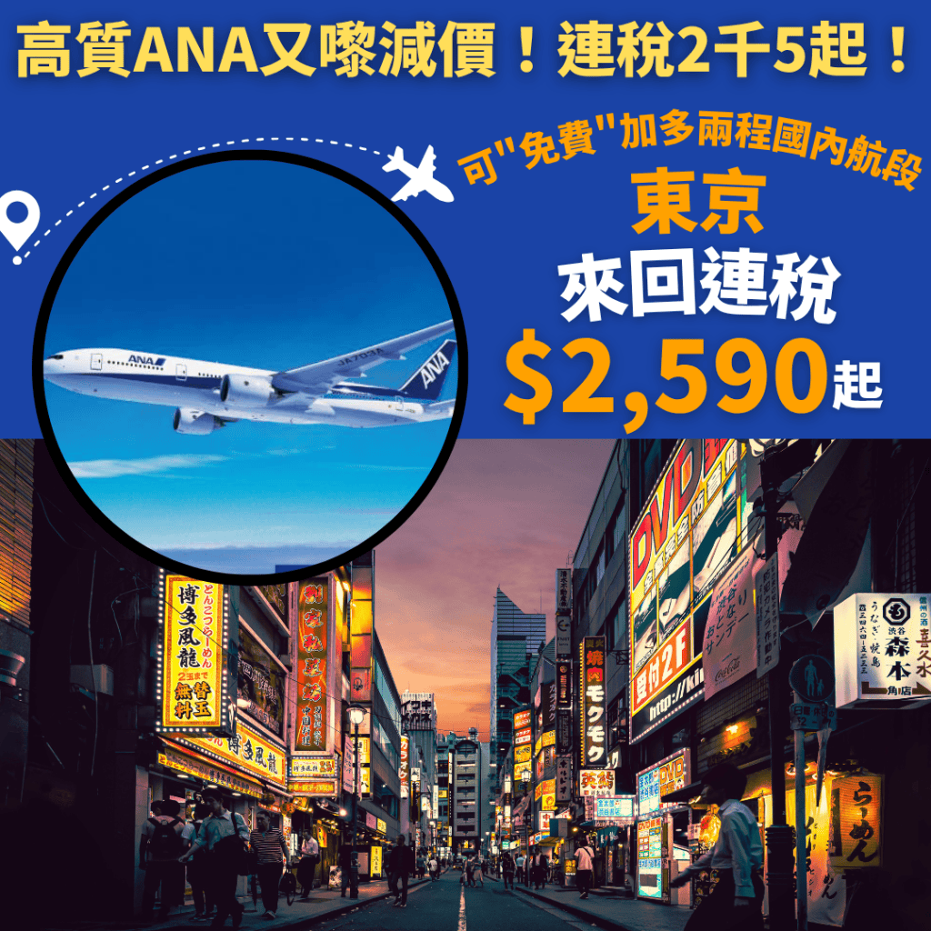 ANA官網https://www.ana.co.jp/zh/hk/ (來回連稅:東京羽田$2,624起、東京成田$2,624起)