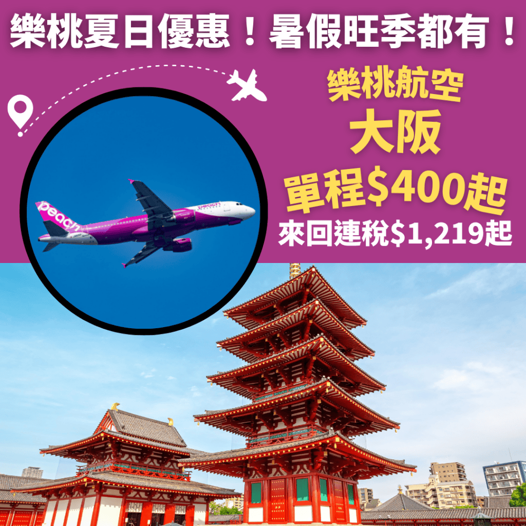 樂桃Summer Sale!連稅千二飛大阪!暑假旺季出發都有!10月25日前出發!香港飛大阪單程只需$400起 (不收燃油附加費) – 樂桃航空 (優惠至6月19日)